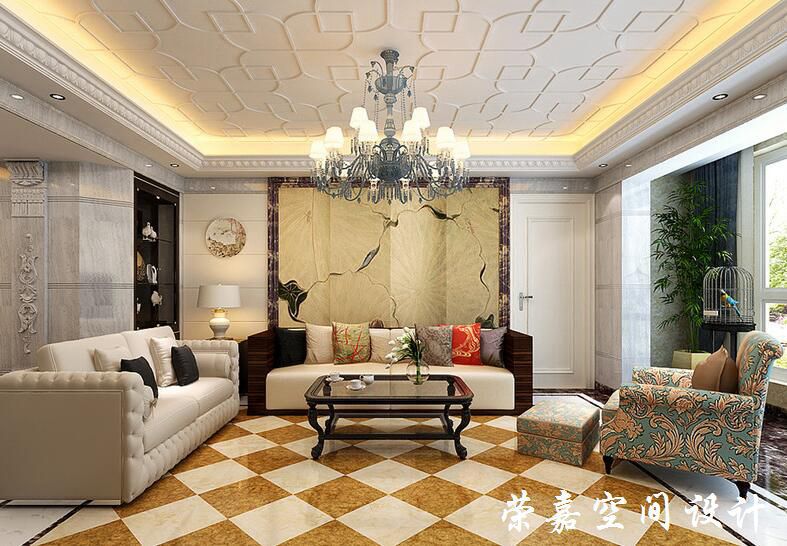 設計師通過變化的形式將石膏吊頂以幾何造型勾勒出立體感,燈帶圍繞在四周提升了豪華感;歐式吊燈作為過渡中和著挑高,黃色與白色菱形地磚以色彩和造型令新古典多樣沙發(fā)更顯華麗。