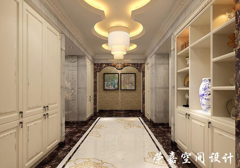 走廊中設計師利用歐式拼花地磚的輕盈與厚重帶你回味傳統(tǒng),而灰色石墻上的法式廊柱樣式帶著法式藝術(shù)的絢爛令空間更具建筑美;新中式吊燈的圓和之意與收納柜上的古董、擺件多了份中式清韻。