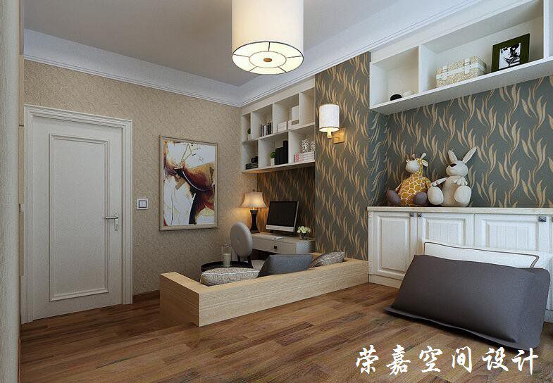 設計師以駝色和墨綠色樹葉壁紙來鋪貼墻面,中性和青翠的色彩讓原本單調(diào)的空間多了份自然般的素樸和清雅;木質(zhì)榻榻米與地板的色彩一致,自然溫實,白色懸掛柜的立體幾何兼具收納作用,簡單貼心。