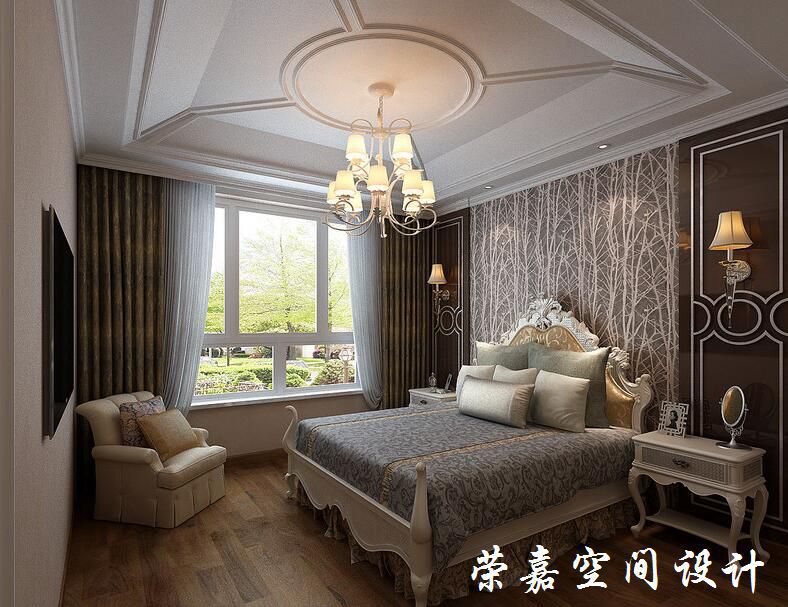 空間的穹頂看似簡約,卻以方圓之意更具內(nèi)涵,歐式吊燈的暖光照耀著深色調(diào)的床品,以明暗來豐富生活的舒適質(zhì)感;咖色幾何立面給予白色古典邊柜呼應,窗簾更添輕曼,森林壁紙與古典雅致相融。