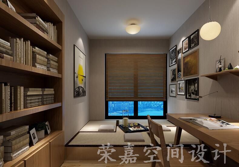 書房以木紋壁紙來營造中性樸質,而榻榻米與藤條窗簾帶著自然般的雋逸與拙樸渲染了一個天然之境;書柜簡潔而實用于木作的家具構成一體,藝術畫點綴出文雅,愈顯沉寂和愜意。
