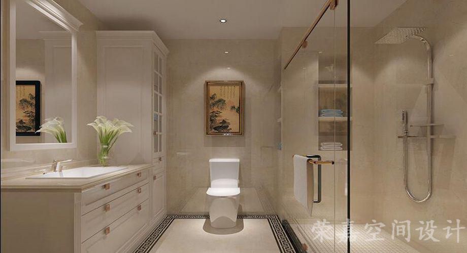 衛(wèi)浴空間清新柔和,利用透明的玻璃將干濕分離;盥洗臺與置物柜高低落差中,帶來強(qiáng)收納儲物功能;地板上的一圈溜邊云紋與裝飾的畫作,突顯出中式的韻味格調(diào)。