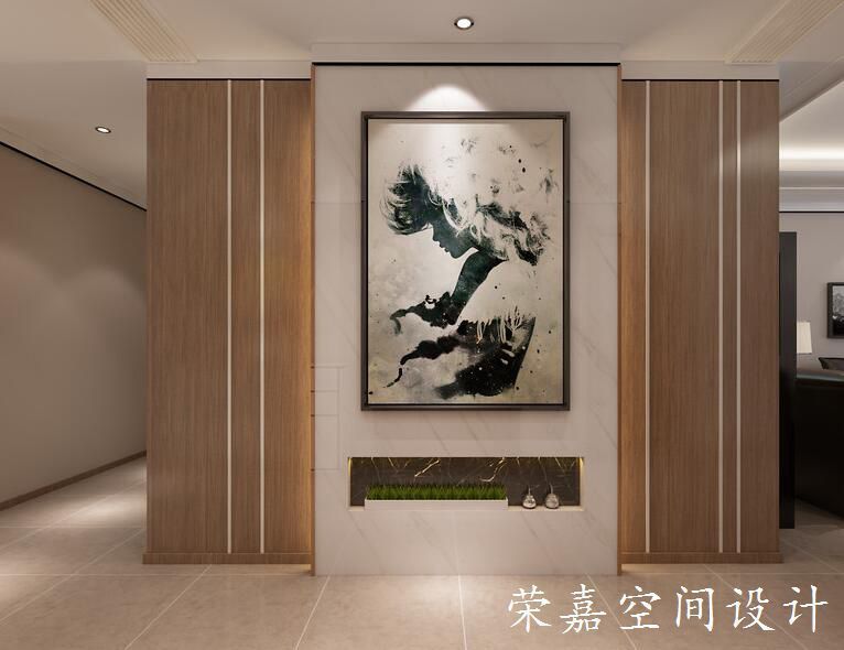 對(duì)稱的木板上白色線條組合出幾何美學(xué),終于白色理石像是要呼應(yīng)客廳電視墻,裝飾的畫(huà)作抽象又極具藝術(shù)畫(huà)面感;下方方形的置物處,點(diǎn)綴了灰色花紋石和一叢綠植,與兩側(cè)的原木材質(zhì)自然呼應(yīng)。