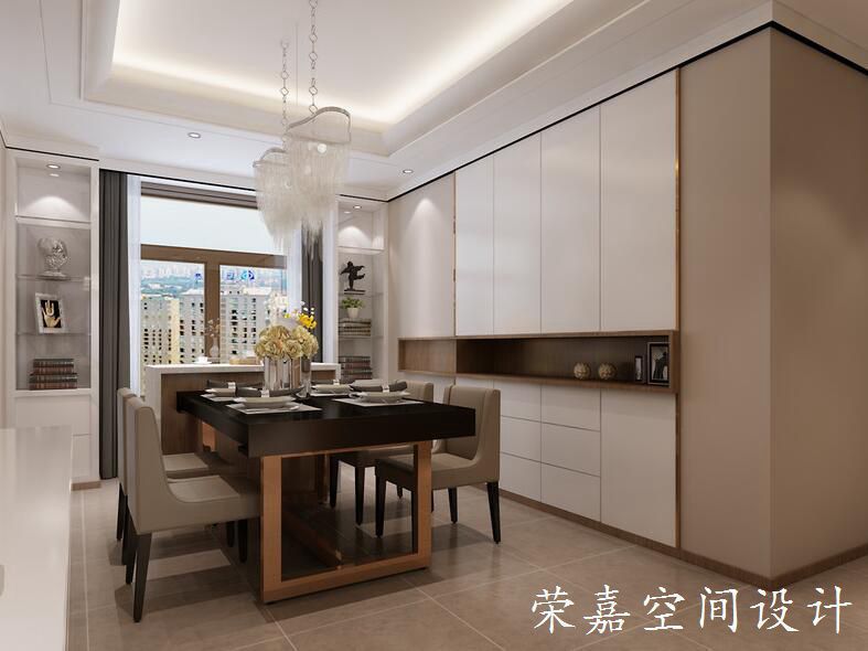 空間增添了豐富的儲(chǔ)物收納功能,并在色調(diào)上形成呼應(yīng),背景墻上的拼接形式更豐富了視感上的層次性;黑金餐桌搭配灰褐色餐椅,瀑布式的吊燈華麗點(diǎn)綴,空間被賦予了低調(diào)輕奢的雅致風(fēng)情。