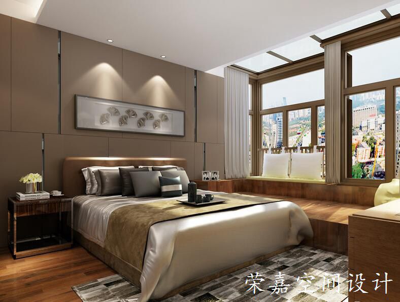 木質(zhì)地臺(tái)與寬敞玻璃窗結(jié)合,加上頂部天窗設(shè)計(jì),充足光線將一室溫暖慵懶的休閑感彰顯,整個(gè)空間也由此顯得通透感十足;自然光入室,落在銀灰色絲質(zhì)床品及金屬色床頭柜上,皆鮮明流露出華貴氣質(zhì)。
