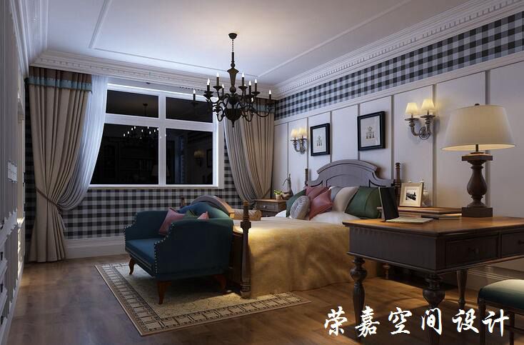臥室輕緩而安適,幾何狀的立面上通過(guò)黑白雙色格子壁紙來(lái)演繹經(jīng)典,正如美式實(shí)木家具的巴洛克之美一樣,讓人歷久旎新;實(shí)木的穩(wěn)重和得體的用色,以美式與古典令空間愈加華美。