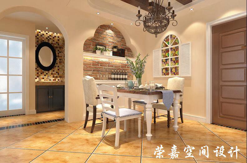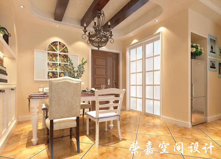 餐廳中瓷磚如黃光暈散開(kāi),經(jīng)受著自然地潤(rùn)澤;白色小窗戶裝飾了墻面,也點(diǎn)燃了田園風(fēng)情。