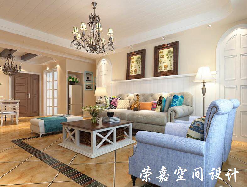 藍(lán)色、駝色的沙發(fā)上因花卉、艷麗的靠墊變得色彩斑斕,活力明艷。