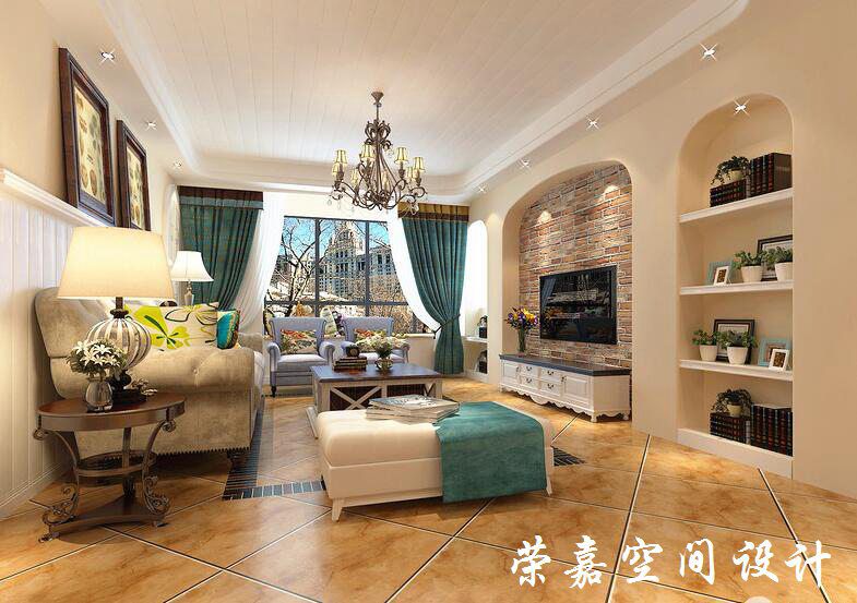 粗糙的背景墻好似拱形門,讓空間建筑結(jié)構(gòu)形式多樣,墨綠色的窗簾搭配淺色沙發(fā)展現(xiàn)了樸實(shí)生活中的雅致。