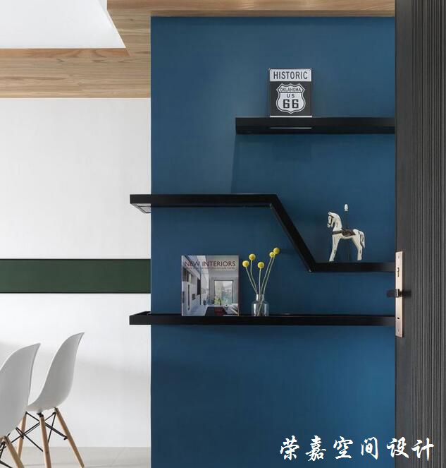 北歐設(shè)計(jì)不追求形式上的獨(dú)特,卻以實(shí)用性為前提的條件下,表現(xiàn)獨(dú)有的藝術(shù)個(gè)性;正如入口區(qū)的藍(lán)色隔板,增添了空間的摩登,木架上的木、花瓶和擺飾突顯了生活的情趣。