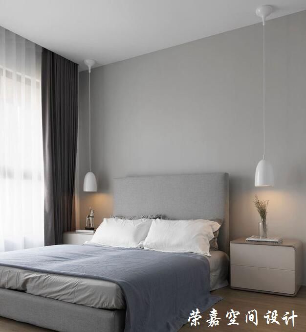 灰色的床與白色的靠墊呈現(xiàn)了素雅靜謐的生活氛圍,空間只有駝色邊柜來(lái)平衡空間的布局,設(shè)計(jì)師力求讓生活趨向極簡(jiǎn);白色圓筒玻璃吊燈是北歐氣息的再現(xiàn),讓人更感舒心。