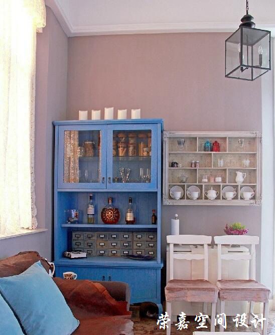 小小的客廳合理利用空間就尤為重要,藍色酒柜與懸掛架將家居用品收納其中,陳列出溫馨的味道,折疊式餐桌方便實用,為生活添彩不少。