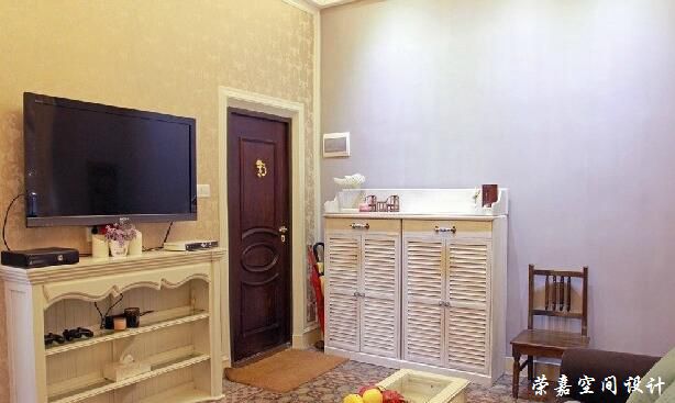 大門右側(cè)擺放電視機,電視柜猶如歐式的壁爐,只是增加了儲物功能;百葉實木鞋柜有著田園的味道,讓空間美觀中不減實用性。