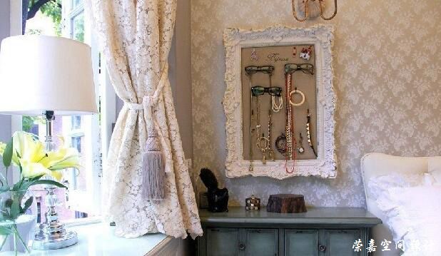 米色的蕾絲布簾是自己DIY做的,相框被改造成了復(fù)古的首飾架與古青色的邊柜透著濃重的復(fù)古情懷,令空間頗具格調(diào)。
