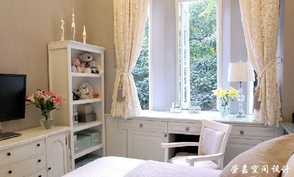 整個臥室以米白色為主色調(diào),窗前擺放兩組菱形的玻璃首飾盒更顯生活情調(diào);白色簡歐家具襯托得房間甜美浪漫。