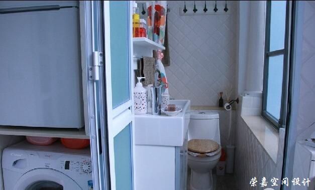 小小的浴室利用到極致,左側(cè)打造為一個內(nèi)嵌式的收納墻,右側(cè)的浴室門三折門方便進出,并利用浴簾做干濕分離,可以充分節(jié)省空間的同時保持空間的整潔度。
