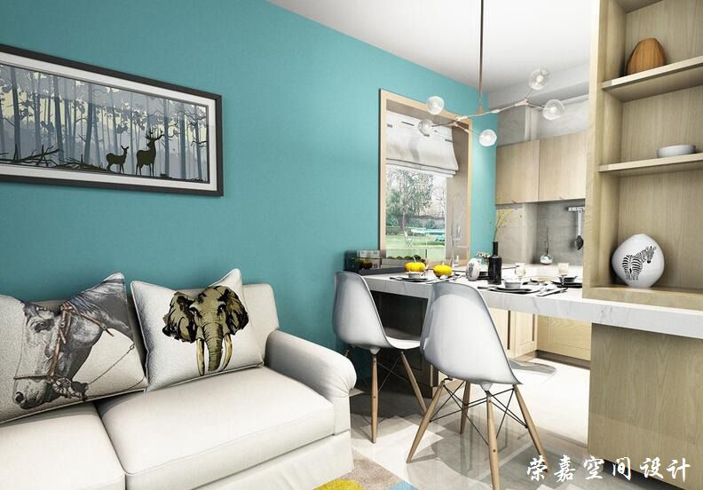 54平方米的空間里演繹著藍(lán)調(diào)幽情的唯美,設(shè)計(jì)師以藍(lán)色著墨空間,讓小空間看起來并不局促,卻多了份大膽的現(xiàn)代風(fēng)和濃縮著生活和藝術(shù)的格調(diào)。通過將整個(gè)空間進(jìn)行整合,大量的閑置空間被利用起來,廚房、就餐區(qū)、會(huì)客區(qū)貫通一個(gè)空間,真正的做到了小空間也有小情調(diào),讓人在這個(gè)自然溫馨的空間中感受著整合給予的曦美。
