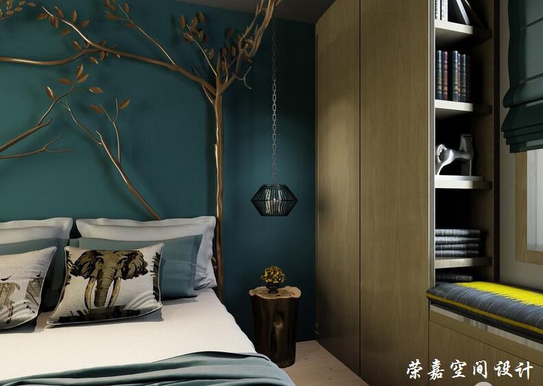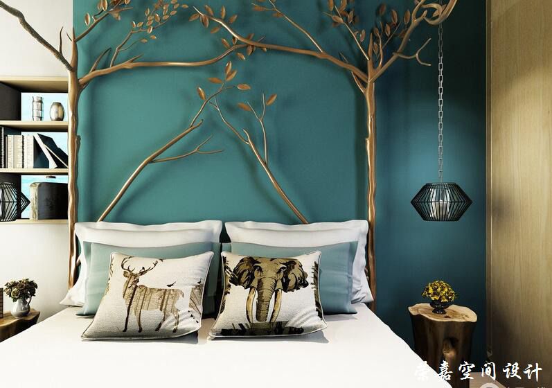 臥室以藍(lán)色為背景,深沉中寓于時(shí)髦,黃銅焊接的樹枝床頭和籠型鐵藝吊燈后現(xiàn)代藝術(shù)十足,卻因?yàn)榘咨财返募儍艋癁閮?yōu)雅寂靜;大象俏皮的圖案簡(jiǎn)約不失活潑,令臥室可愛與爽朗并重。