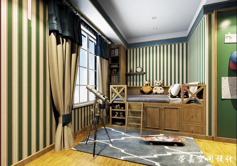 兒童房通過原木床營(yíng)造自然親近的整體氛圍,綠和黃形成的條紋壁紙除了色彩上映襯空間外,讓設(shè)計(jì)文化底蘊(yùn)中隱藏的活力留駐在此。