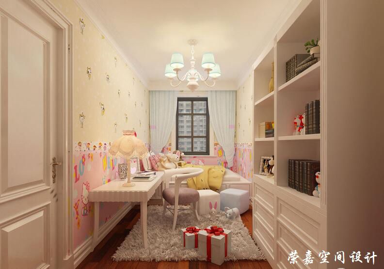 粉色與淺橘黃背景墻上卡通印花繽紛渲染,活力童趣彌漫空間。晶粉色的學(xué)習(xí)區(qū)及白色置物架,色調(diào)輕盈,彌補(bǔ)兒童房空間相對狹小的不足,在毛絨地毯的鋪陳下,帶著溫馨暖意。