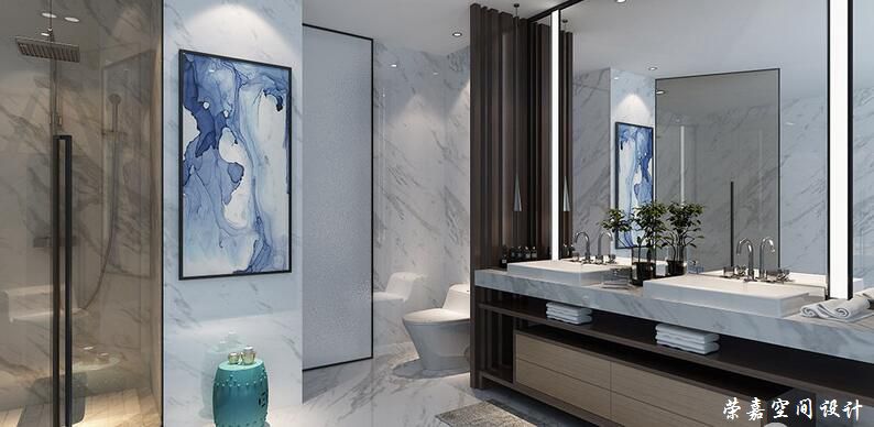 衛(wèi)生間的格局不甚方正,設(shè)計師利用格局上的缺點(diǎn)將干濕區(qū)域形成分離,保持空間上的干凈清爽;雙盥洗臺下設(shè)計了隔板收納,將物品隱于無形;點(diǎn)綴的畫作,縹緲間帶著隨性感。