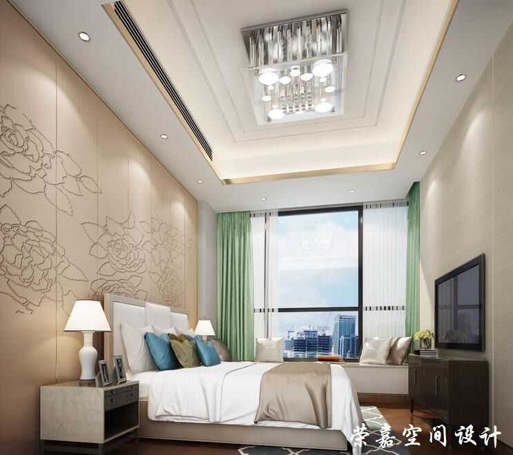 臥室以中性色為主,從雕花背景墻到床品只為營造一份樸樹和雅;綠色窗簾和藍色靠墊的輕色帶來色彩上的悅動,讓沉穩(wěn)的家具也煥發(fā)生機;而矩形燈飾和藏藍色菱形地毯添置優(yōu)雅,溫馨而舒適。