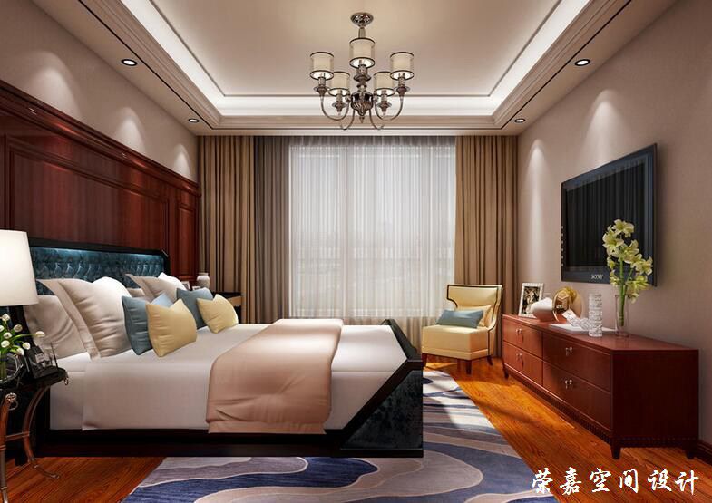 臥室的立面以駝色的中性之雅蔓延至四處,與實(shí)木地板的橙紅色形成強(qiáng)烈的反差,讓空間更加多彩;除去新古典家具的曲線優(yōu)美外,藍(lán)色地毯的變化感與純色靠墊和扶手椅的典雅,令空間溫馨之外更典雅。