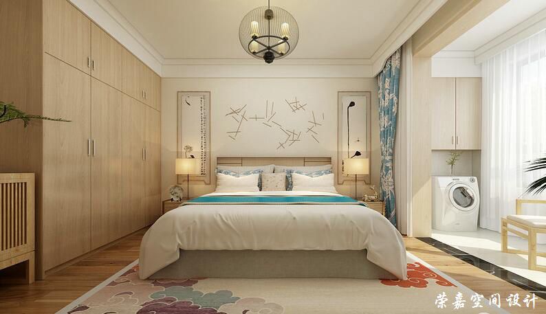 充足的光線使臥室顯得溫和靈動,原木色中清雅的藍色上綴滿印花,地毯上祥云隨性飄逸,輕描淡寫的水墨畫淺淡渲染,滿室流動著寧靜詩情。