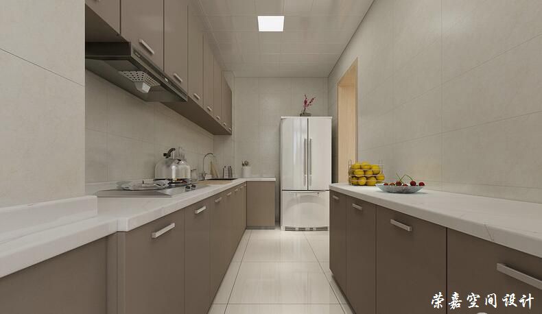 廚房將具備豐富儲物功能的櫥柜靠墻擺放,空余出狹長的走道,櫥柜與臺面、墻面的深淺搭配,帶著素縷安然的靜和;白色的家電藏匿與角落,與櫥柜高低相依,頂上陶瓷花束,清新雅逸。