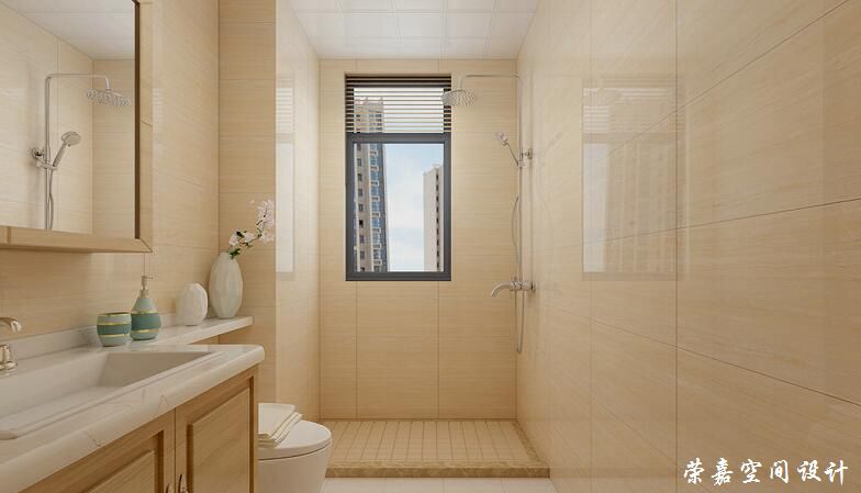 暖黃色氳著溫馨的氛圍,使衛(wèi)浴空間透著舒緩平和;空間未做干濕分離,但在淋浴區(qū)鋪高了一層防滑板,無形中劃分了功能區(qū)域;簡白色的盥洗臺臺面做了延伸,其上的擺件典雅沉靜。