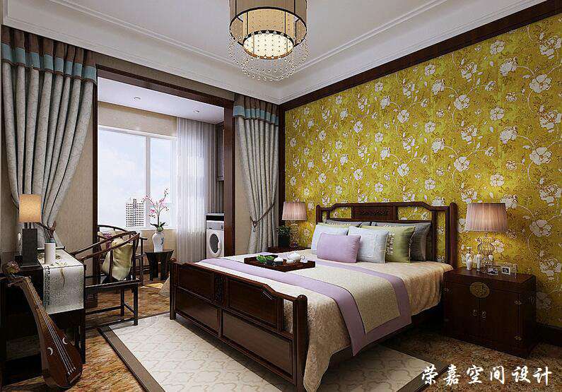 明黃色印花墻面極具視覺沖擊力,瞬間使空間充滿了明媚的浪漫熱情;沉穩(wěn)的木質(zhì)家具,配上布藝的柔婉和清新,在花植、擺件及樂器的營造下,愈加的顯得詩情光華。