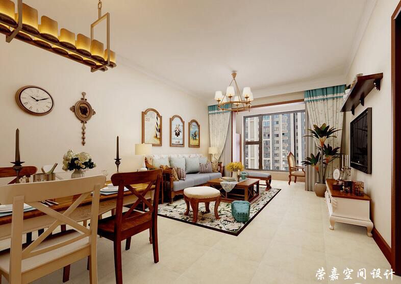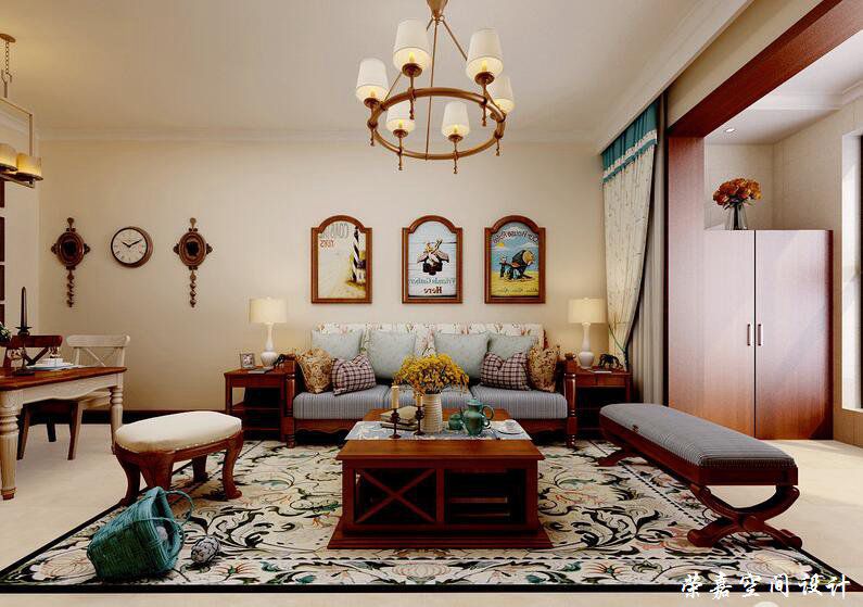 客廳以米色調(diào)來(lái)渲染空間,褐色實(shí)木家具無(wú)形之中與其打造出一個(gè)暖意十足的田園時(shí)光;抽象生動(dòng)的花卉地毯將田園的生機(jī)和實(shí)木的樸實(shí),與藍(lán)色碎花靠墊的清新、拱形藝術(shù)畫(huà)讓家充滿活力。