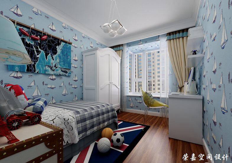 兒童房里被航海帆船為概念的壁紙所包裹,地圖掛畫好似寓意未來的海天夢醒之旅,從而滿足孩子天馬行空的想象;藍色格紋床品顯得素雅寧靜與白色家具融合為一,而童趣的玩具打破常規(guī),攜入新能量。