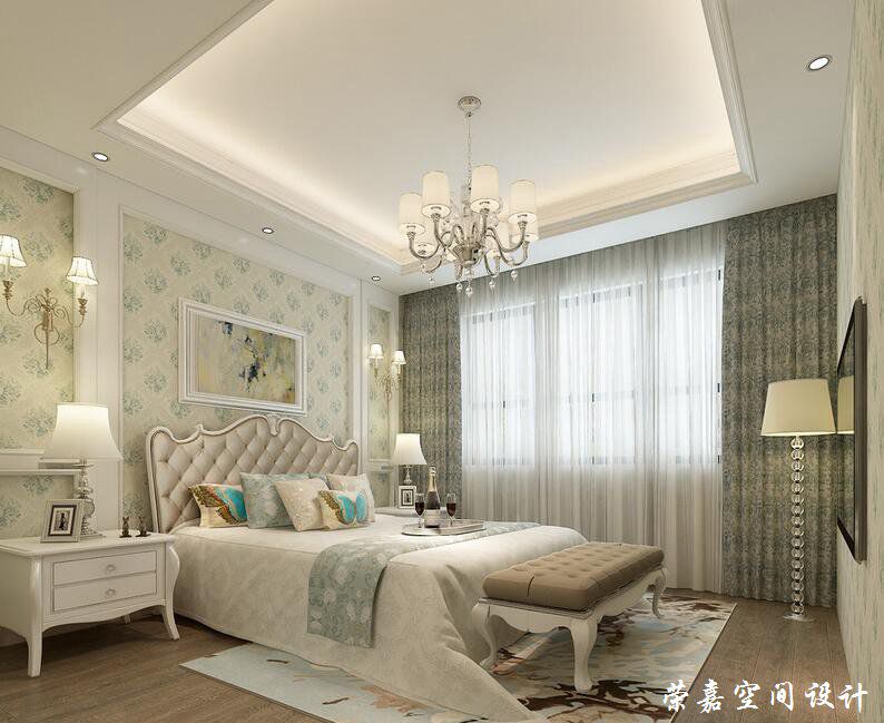 白色的矩形吊頂在燈光的掩映下愈顯純凈,淺綠色花卉壁紙與窗簾以明暗形成對(duì)比,卻以田園般的雋永更顯輕快;白色邊柜和床尾凳的巴洛克風(fēng)帶著奢華,與復(fù)古感的金屬燈具輝映著清雅的奢貴。