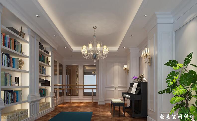 休閑室在清新的白色底色中,將多立克柱式內(nèi)嵌墻面,形成規(guī)整、對(duì)稱的華貴氣質(zhì),內(nèi)嵌的格架書柜里擺放著豐富的書籍,在樂器的琴音聲中,制造一室豐盈的藝術(shù)文藝底蘊(yùn)。