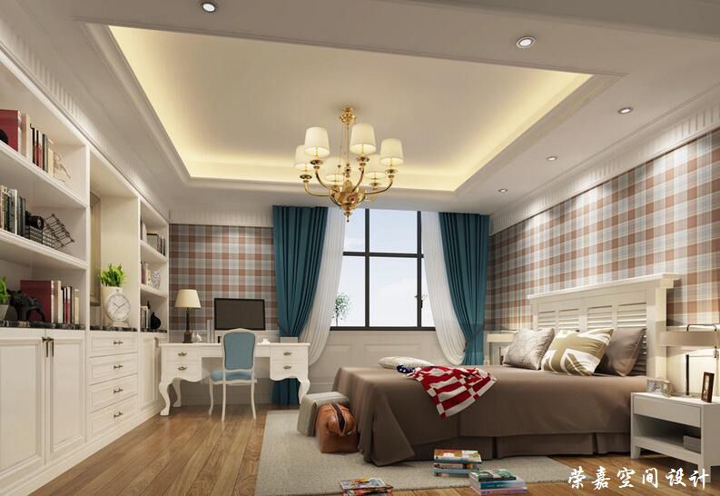 書房以深淺相搭的色調(diào),采用對(duì)稱的方式,結(jié)合壁紙印花及金屬材質(zhì),不動(dòng)聲色間將輕奢華貴的復(fù)古氣息融于空間;書架上擺放的紅色臺(tái)燈裝飾,點(diǎn)綴出幾分跳脫的活潑。