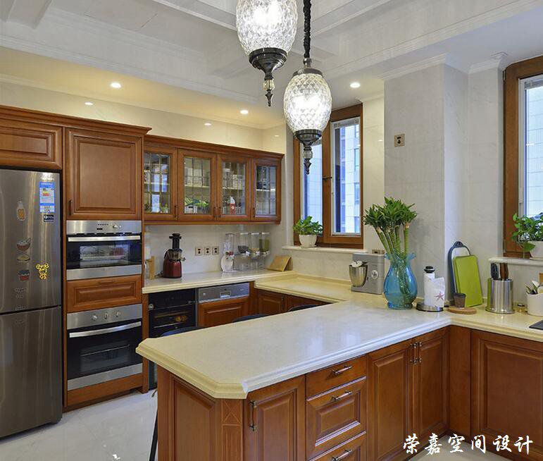 廚房利用中央連接的拼接島臺(tái),將空間的中西廚輕松劃分開(kāi)來(lái),家電的內(nèi)置,形成規(guī)整的空間秩序。棕褐色的實(shí)木配白色理石,既有輕盈明快又具沉穩(wěn)大方。