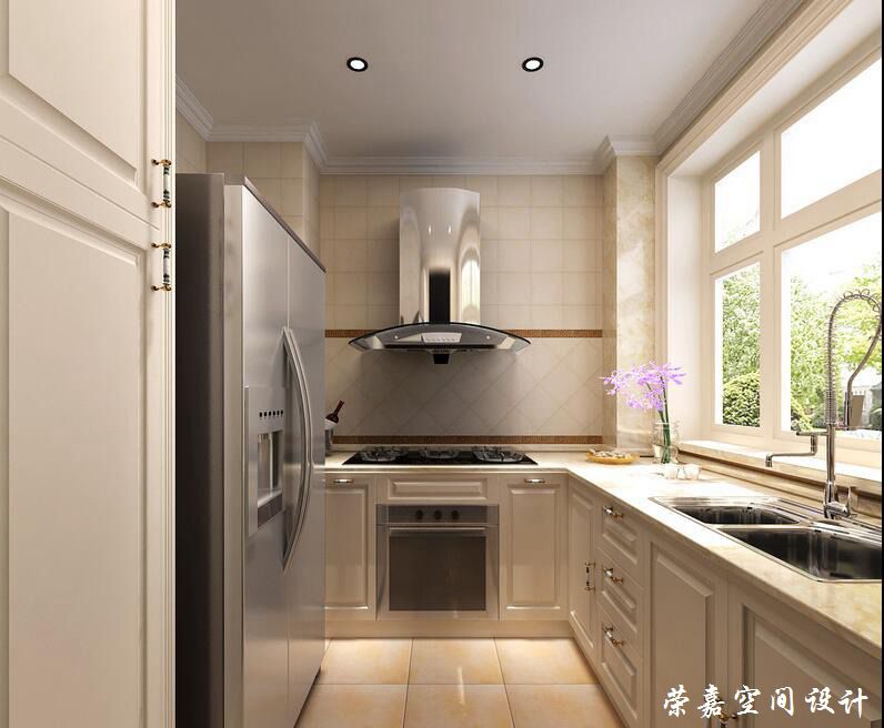 U型的廚房空間,設(shè)計師以L型櫥柜搭配大件家電的形式,既能保證空間豐富的存儲功能,又合理的利用空間,水槽與灶臺之間留出合適的操作臺面積。鋪貼的墻、地磚分別以正格和菱格方式展現(xiàn),避免單