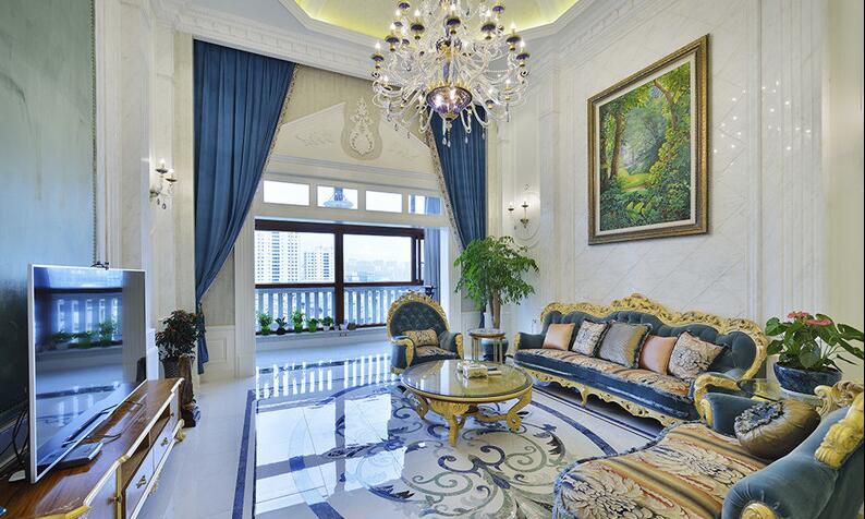 一眼到深處的空間里,浮雕般的檐廊與膏線勾勒出華貴的空間形態(tài),西方建筑馬賽克畫作以背景烘托著高雅的紫色沙發(fā),邊緣鑲嵌的金色線條與畫作、圓凳形成呼應(yīng),空間展現(xiàn)出極簡法式的浪漫。