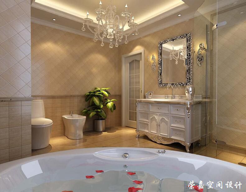 暖黃色的衛(wèi)浴空間色調(diào),帶來溫馨的環(huán)境。極具歐式精致的雕花的鑲嵌,使盥洗臺和浴室鏡展現(xiàn)出華麗的優(yōu)雅。局部墻面采用墻磚的拼接鋪貼,以小細節(jié)營造空間視覺上的層次感。