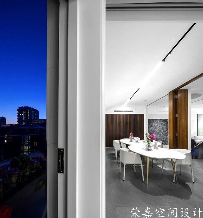 水晶材質(zhì)的茶幾更具高級感,隔斷也用玻璃代替,讓空間擁有極高的通透感,為了避免大面積白色帶來審美疲勞而采用特別的地板。