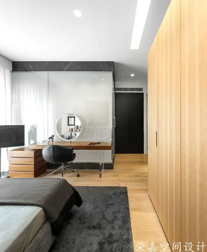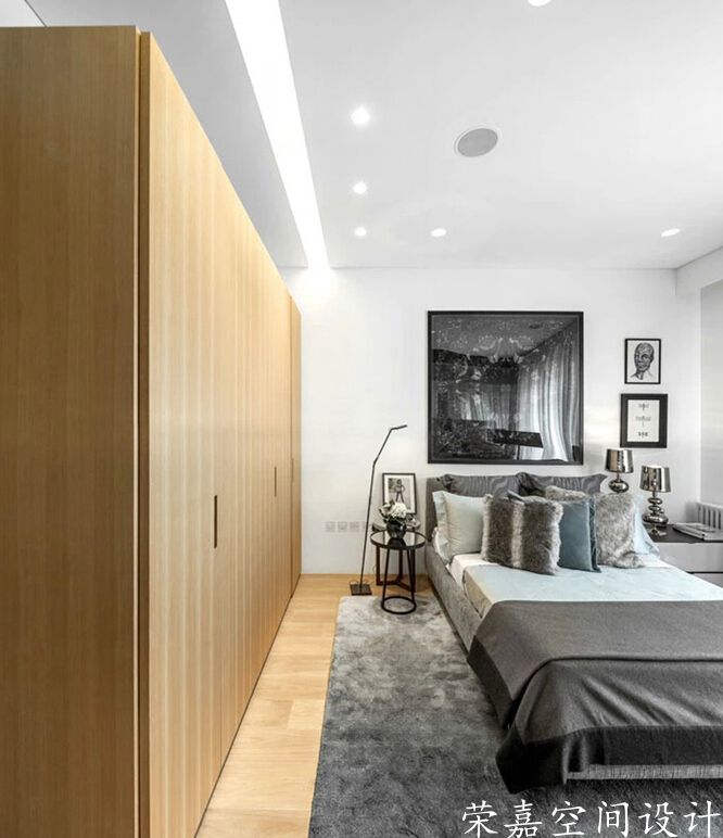 在臥室墻邊安裝了一整面墻的衣柜,和地板顏色一致,并不會因為灰黑色的為主的床單被套而產(chǎn)生不和諧。