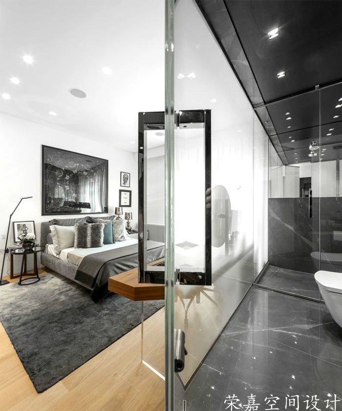 衛(wèi)生間就在臥室內(nèi),用一面不透明玻璃玻璃隔開,又沒有完全隔絕。浴后水汽附著在玻璃上,氤氳與朦朧,風情萬種。
