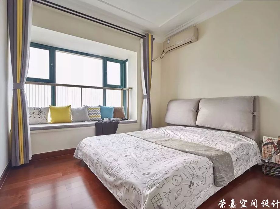 ▲褐色的原木地板搭配杏色墻面,強(qiáng)烈的色彩沖擊著視覺,在搭配素雅簡約的床單,還有飄窗上鮮艷活力的抱枕,讓臥室充滿了浪漫的情愫。