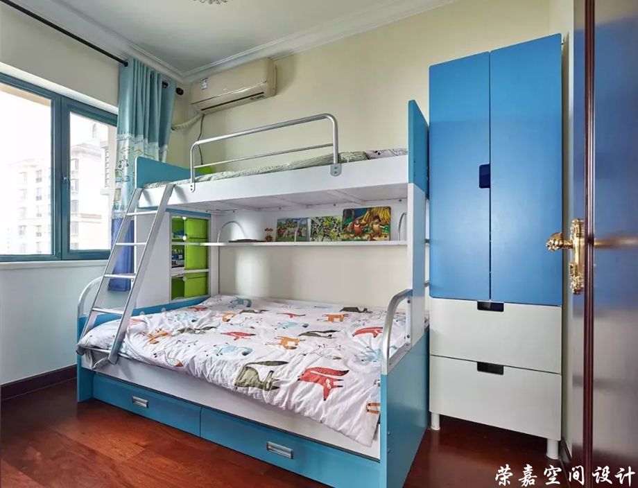 ▲原木的地板有助于培養(yǎng)孩子穩(wěn)重的心性,藍(lán)色的家具活潑氛圍,色彩上相互中和,有利于兒童成長。