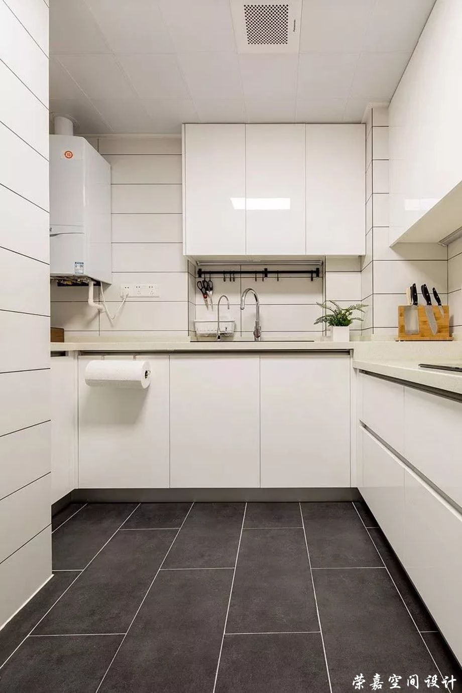 廚房內(nèi)部的空間不算很大,門和柱子之間剛好擺放下一個冰箱,灰色的地磚和白色的柜體、墻面集合起來,簡潔而又大方。