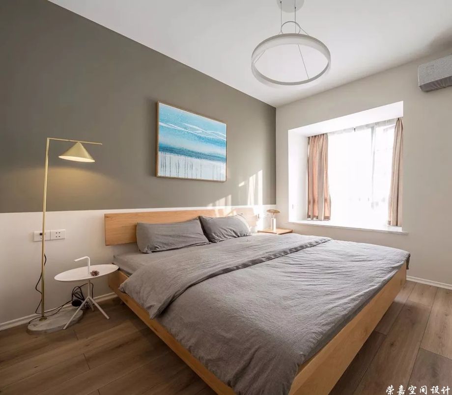 主臥室的床頭背景墻以米白色和灰褐色做了劃分,讓層次感變得更強,木質(zhì)床和灰色床品的結(jié)合,在落地?zé)艉完柟獾恼找?,顯得簡約而又自然。