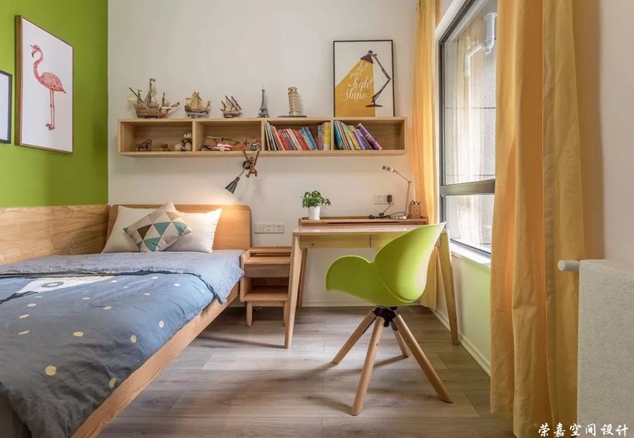 次臥的空間比較小,把柜子做在了床尾,床頭處擺放書桌,墻面也做了置物架,滿足孩子讀書學(xué)習(xí)的需求。