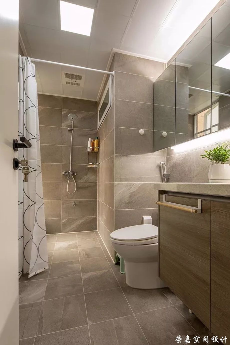衛(wèi)生間的空間不大,淋浴區(qū)用浴簾來劃分,馬桶側(cè)面是廚房延伸出來的小空間,一個假窗的設(shè)計讓廚房也能借到光。大面積的鏡柜搭配藏光的設(shè)計,讓衛(wèi)生間看起來更加寬敞。