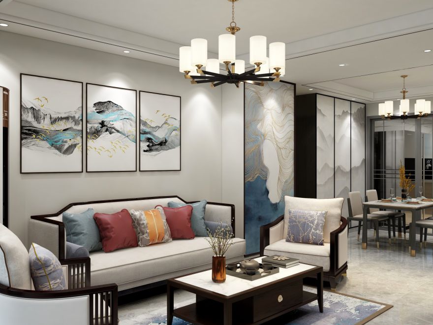 一層客廳色設計師選用靜謐藍,配合輕奢金,明亮淡雅,突出點亮空間,又汲取了文藝復興的一些藝術靈感引入空間,素色軟飾增強了空間呼吸性,復古格調讓空間更有藝術氣息。現(xiàn)代感家具被賦予更多質感,與精致飾品化身為新藝術潮流。經典的黑白元素,也愈加凸顯出家具的質感,白色主打的背景基調,空間所展現(xiàn)出的奢貴,點燃了空間氛圍。